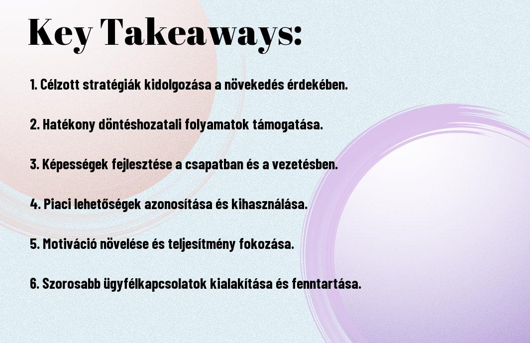 Az eredmények mérése és értékelése nélkülözhetetlen a bevételnövelés érdekében. A business coach segíthet abban, hogy világos célokat tűzz ki, és nyomon kövesd a fejlődésedet. Az adatokra alapozott döntéshozatal lehetővé teszi számodra, hogy azonosítsd a megvalósult sikereket és a fejlesztési lehetőségeket.