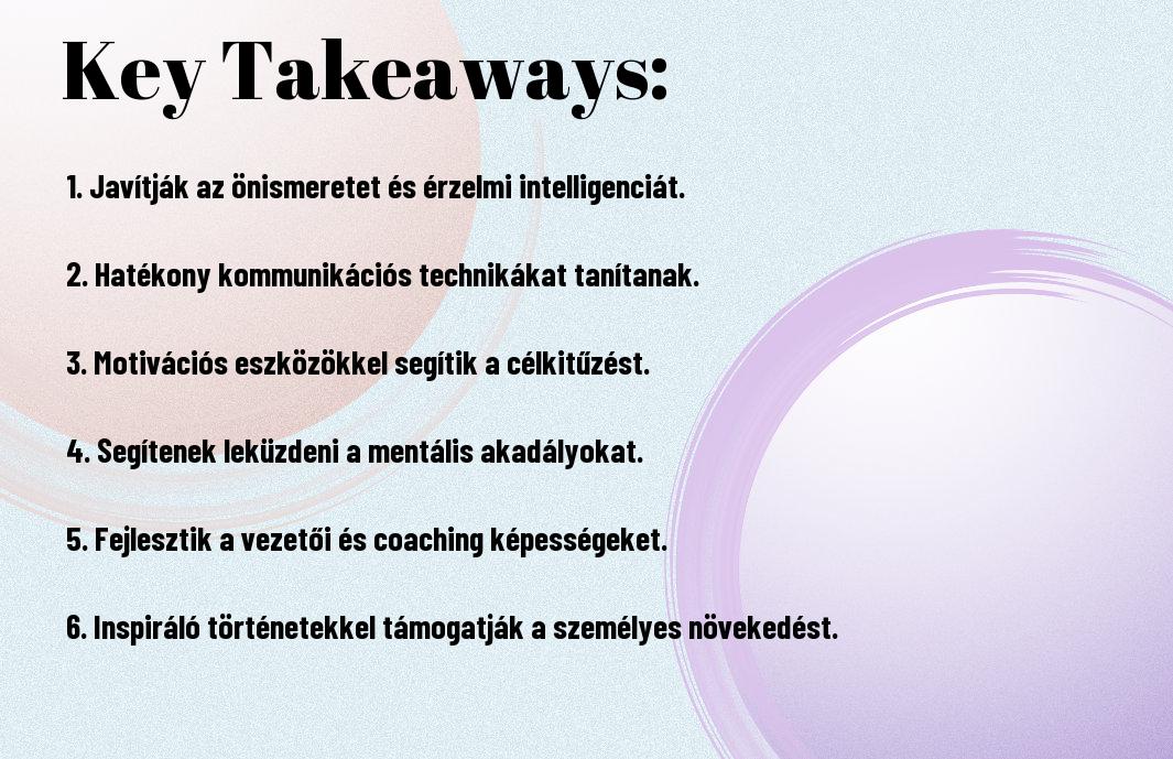 A: Ezek a könyvek különféle eszközöket és technikákat kínálnak, amelyek segítenek a céljaid elérésében, az önbizalom növelésében, és a hatékony kommunikáció elsajátításában. A coach könyvek gyakran tartalmaznak gyakorlati példákat és feladatokat is, amelyekkel a saját életedre alkalmazhatod a tanultakat, így konkrét fejlődési lépéseket tehetsz.